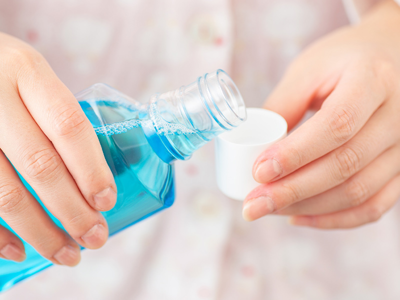 寝る前の歯磨きの仕上げに、殺菌剤入りの「デンタルリンス(液体歯磨き・洗口液)」を使用しましょう。細菌の増殖を抑え、朝起きた時の口のネバつきや口臭予防が期待できます。